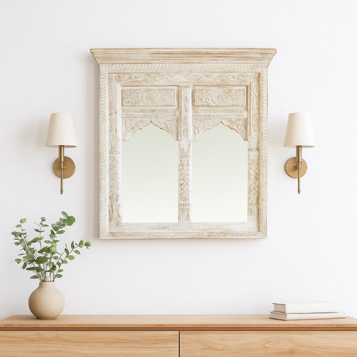 And hence you do not want to miss out on this 2 arch hand carved mirror frame with intricate wood work and a distressed finish.