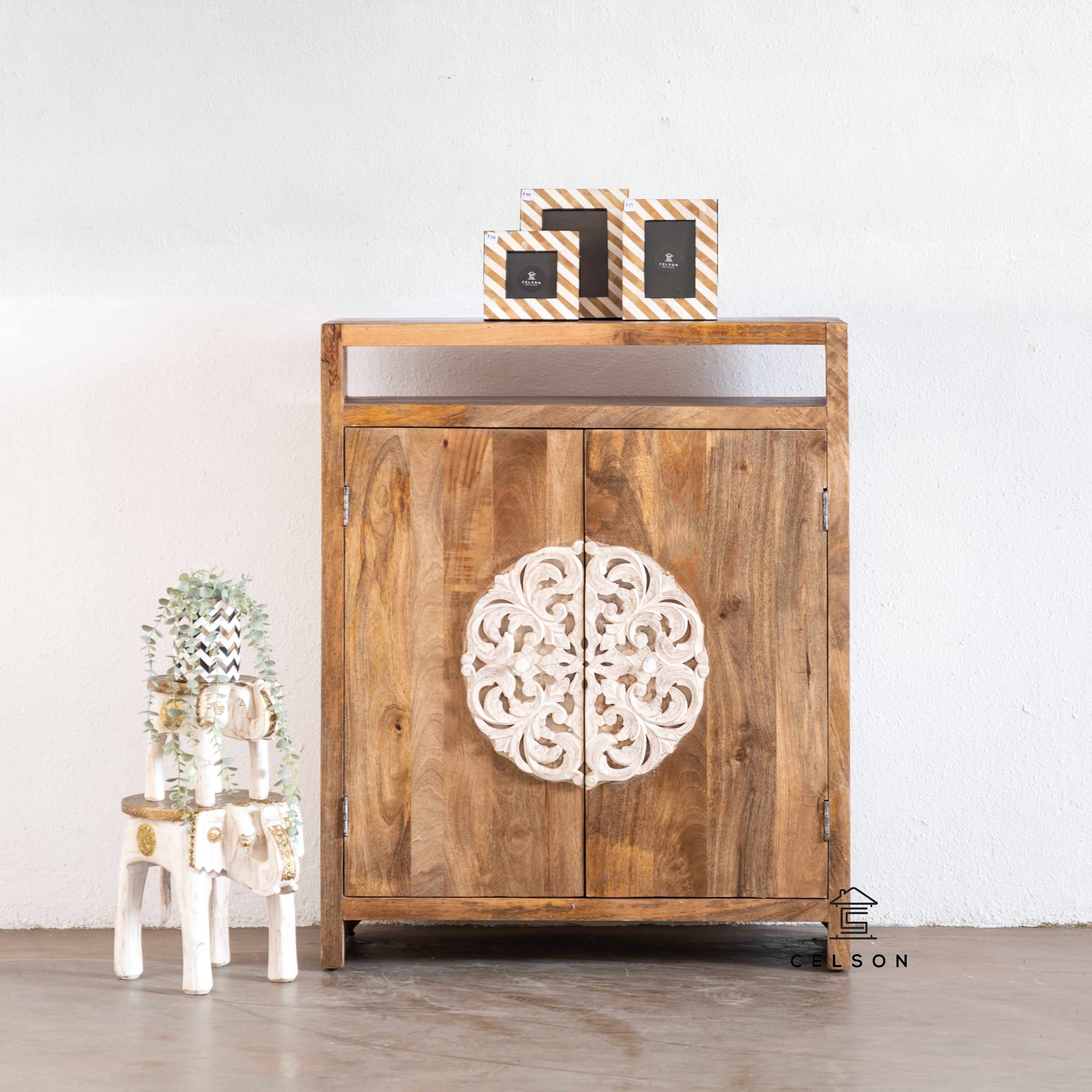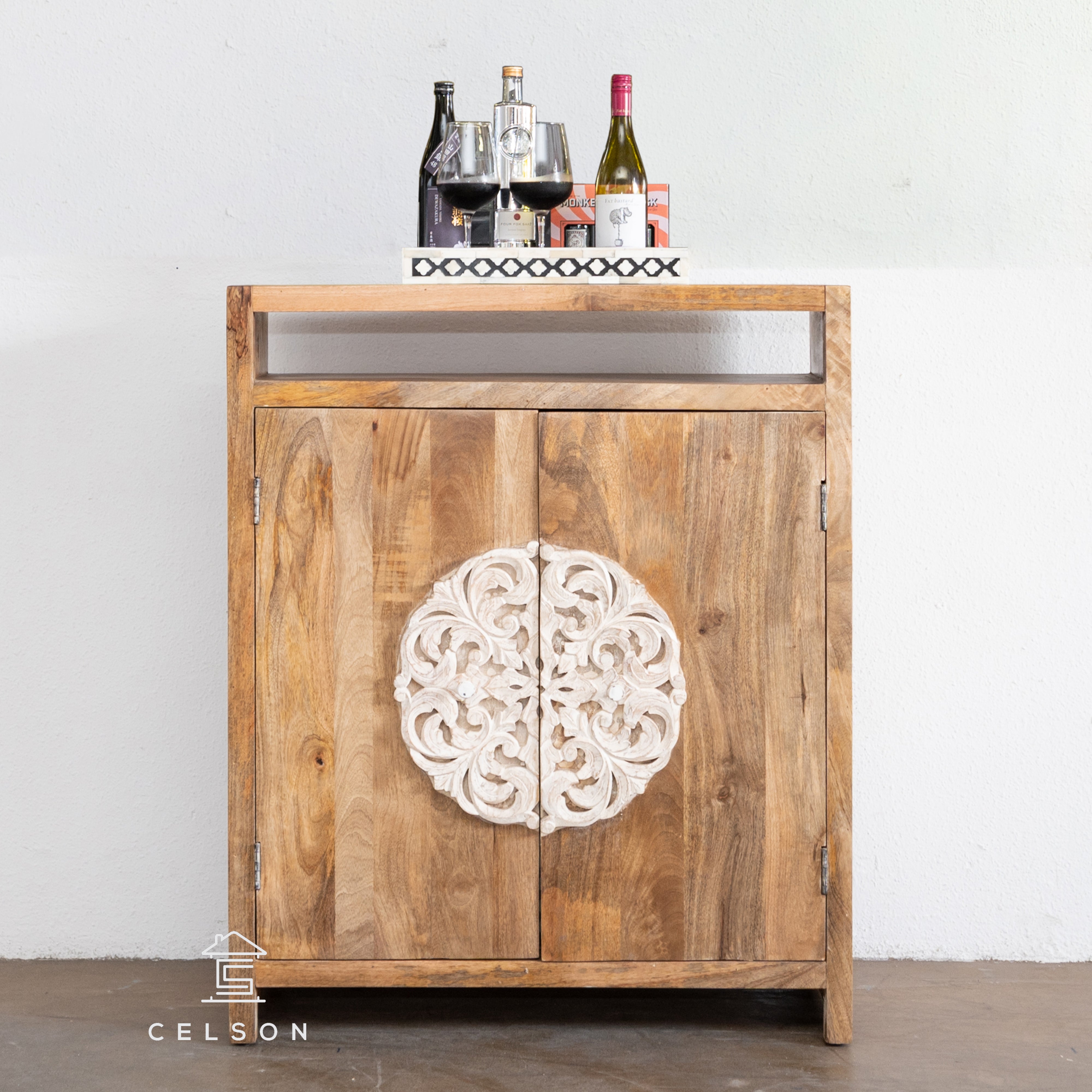 Our solid mango wood bar is the perfect home for all your wine bottles & more with  shelves & exteriors that are awe worthy.