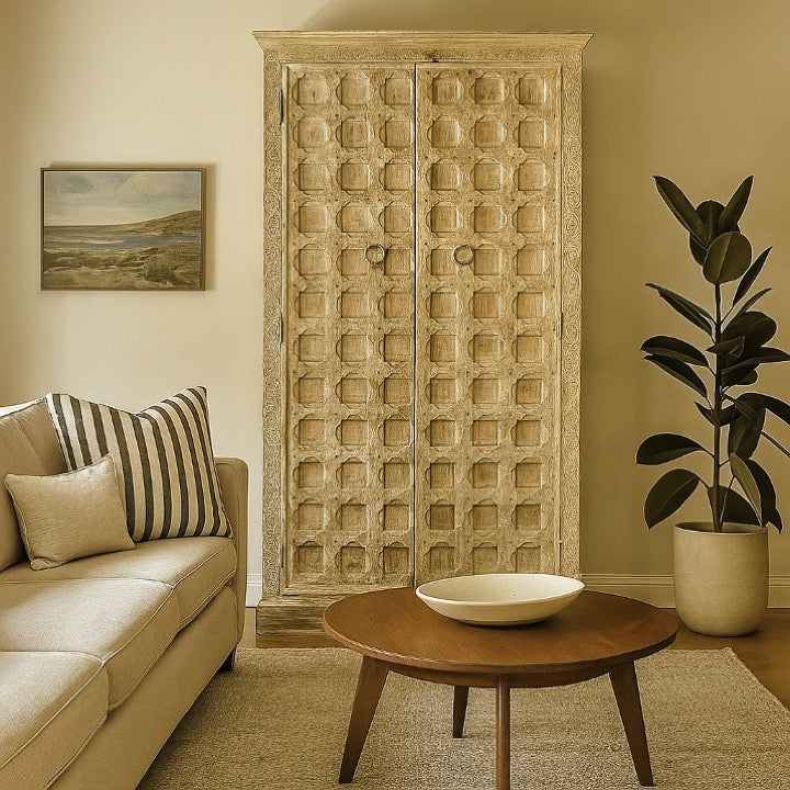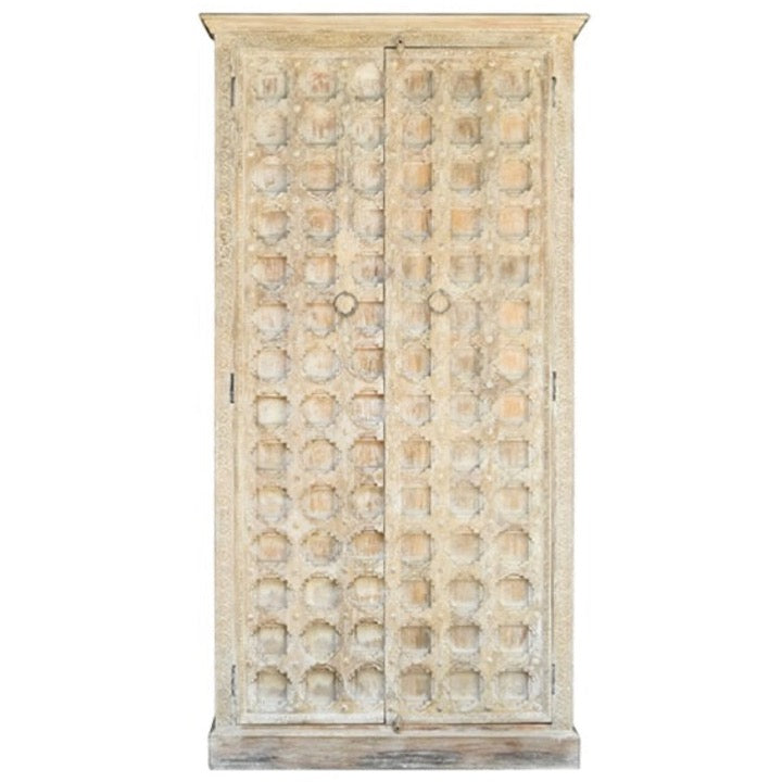 Our James almirah, having sturdy mango wood construction with beautiful natural and white washed finish works perfectly with the color scheme of any bedroom, living room, and hallway or entryway.