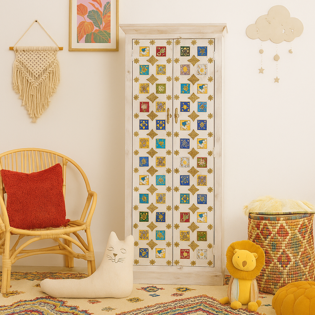 Our Cages almirah has sturdy mango wood construction & a multi colour tile door with brass fittings.