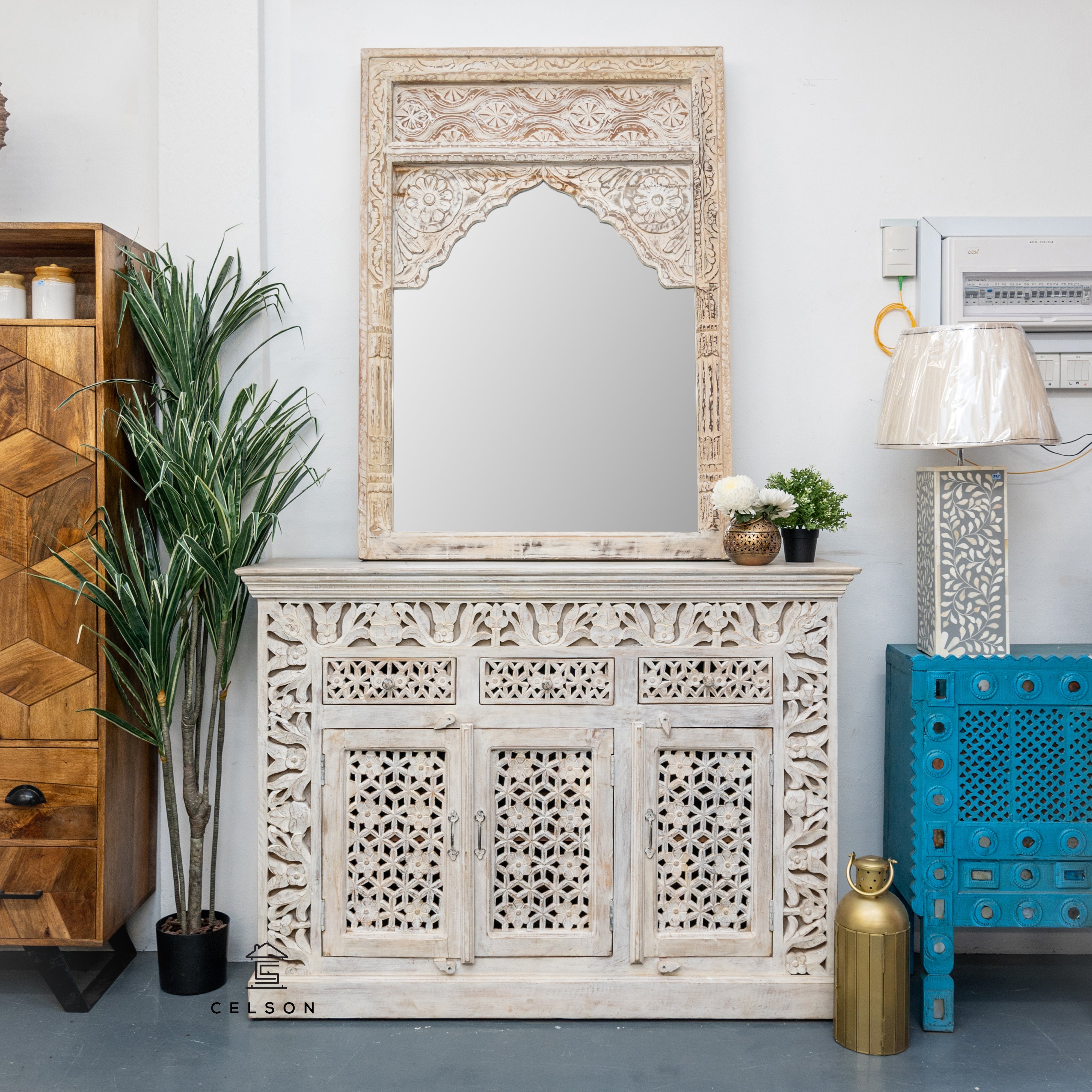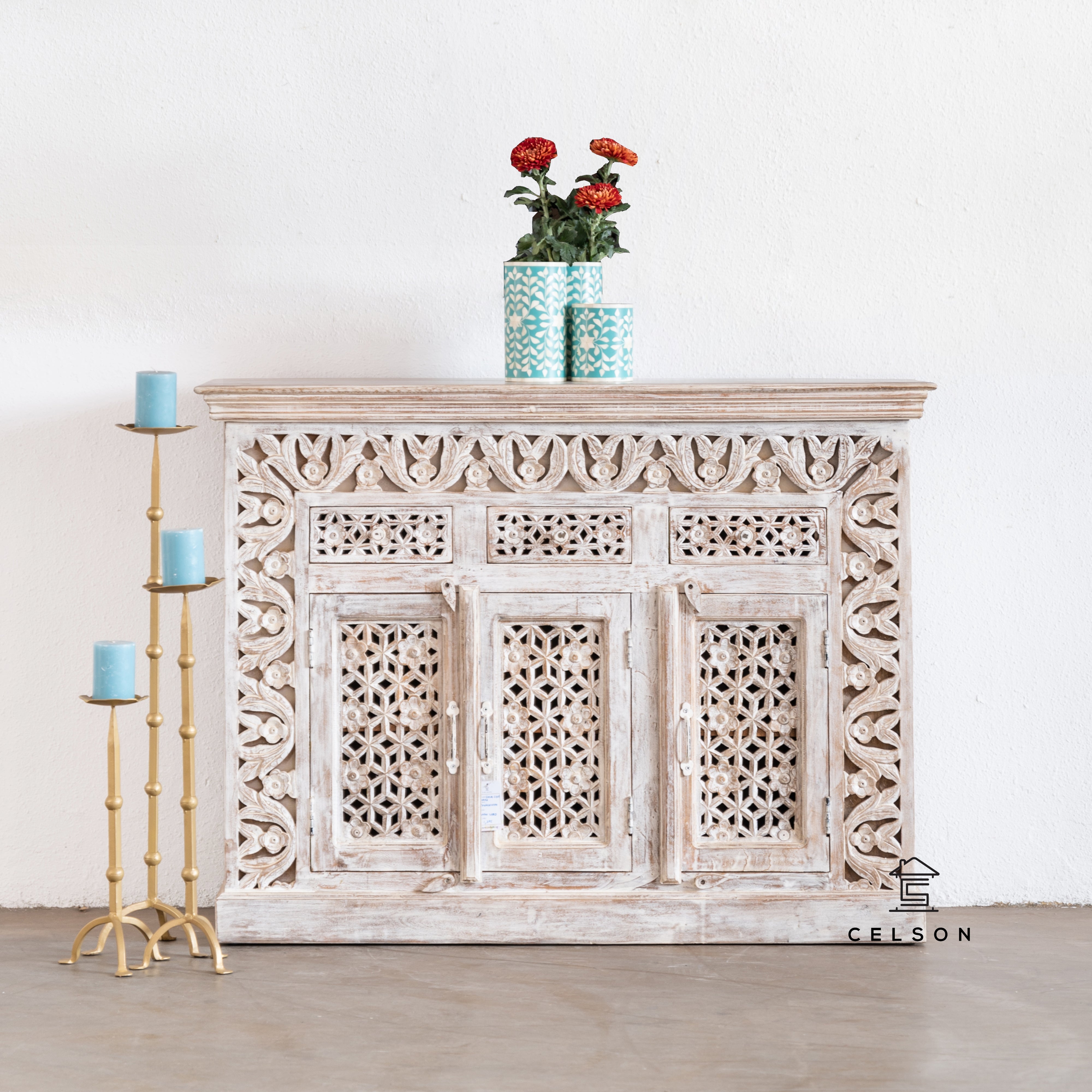 This white washed finish sideboard is an absolute eye catcher with its hand carved design and complimenting metal pulls - all made to mimic a fire place!