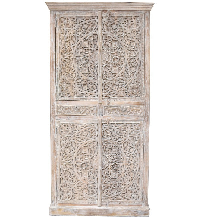 Our hand carved. Distresses white tall cabinet can be perfect cupboard. It has multiple shelves with 4 door inside to neatly store all your clothes and two drawer at the center!