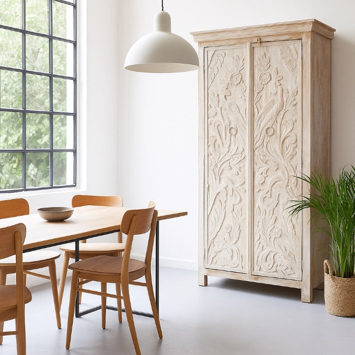 This lovely cupboard comes with peacock & floral motifs on its doors set in a white wash finish.