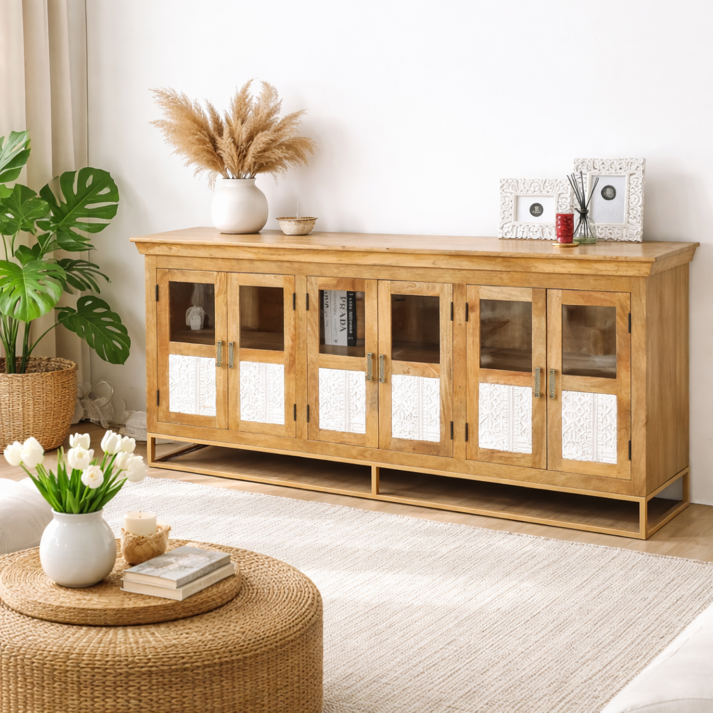 Looking for the perfect entryway upgrade? This dual-tone, hand-carved sideboard with 6 spacious doors brings both beauty and organisation to your home.