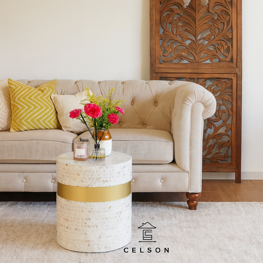 This MOP Inlay stool can be used in multiple ways - as a bed side table, as an end table, as a coffee table, as a stool, as a bar seat and so much more!
