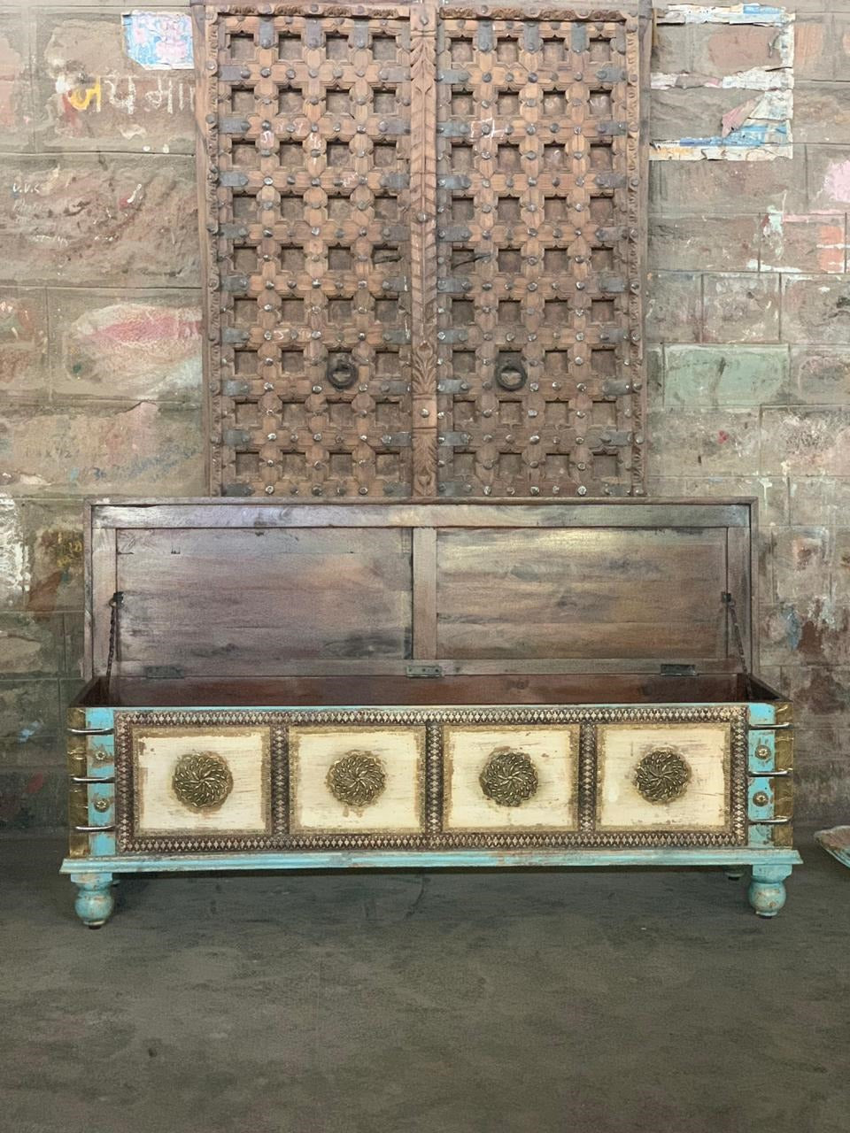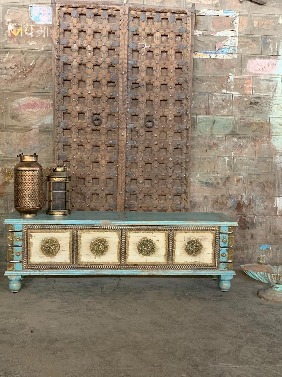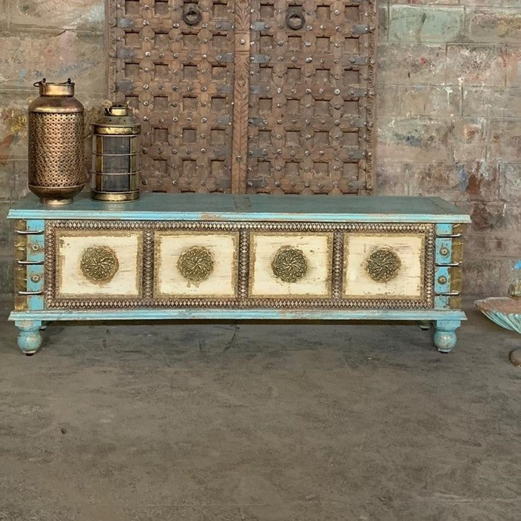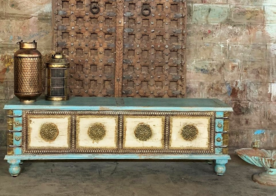 This coffee table cum trunk has our whole heart! Even though it’s neutrally coloured in shades of brown with brass accents & metal cladding work on both sides, it does not fail to make an impact!