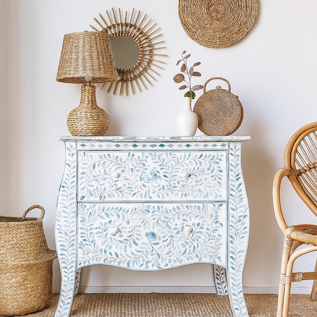 This bone inlay blue color cabinet is an absolute eye catcher with its floral design and complimenting metal pulls.