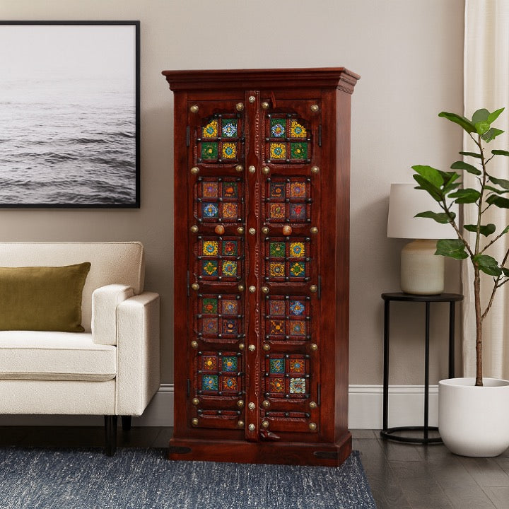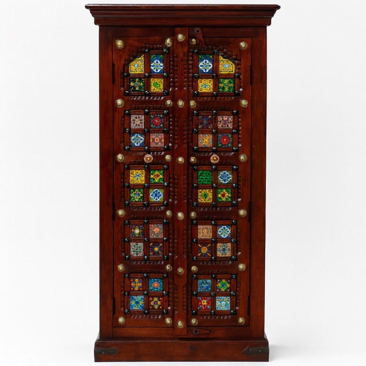 Designed for both beauty and function, the Almirah is crafted from solid mango wood and detailed with multicolour tile doors and elegant brass fittings. Inside, four spacious shelves to offer smart, organised storage.