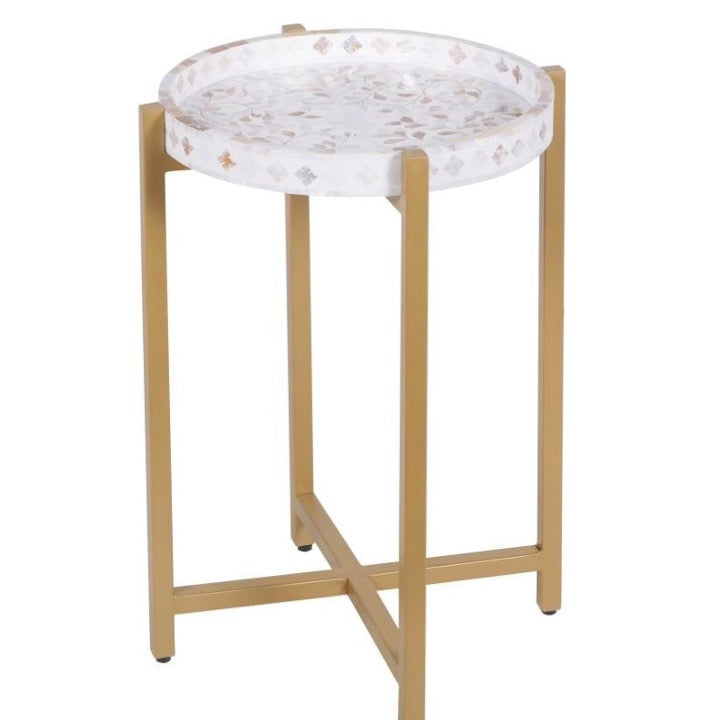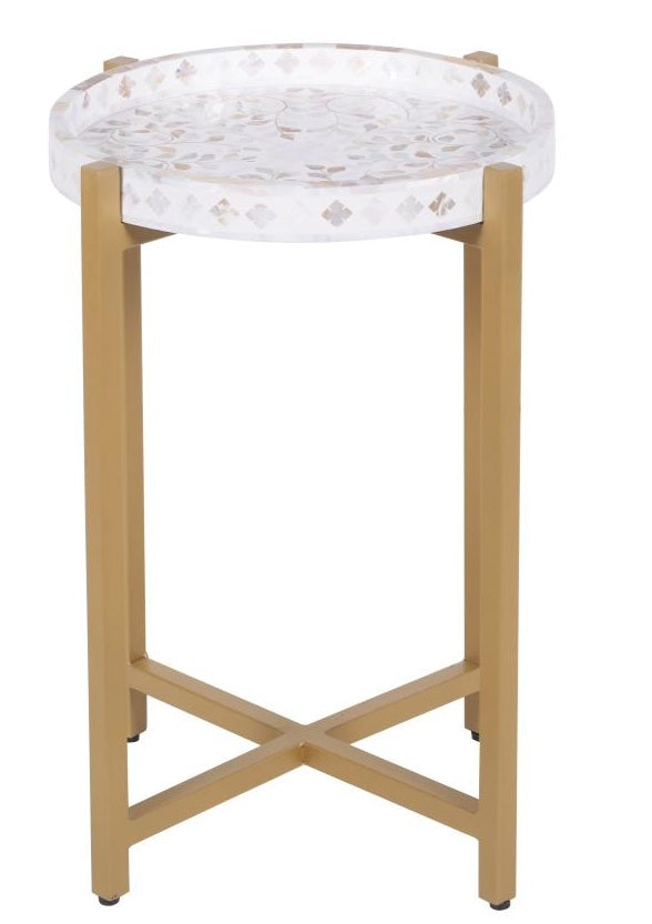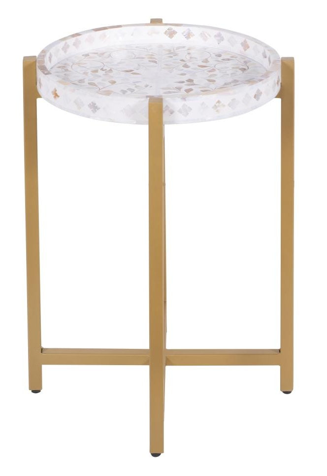 Combining a smooth round top with modern gold legs, this mop inlay side table is a stylish accent that suits any contemporary home.