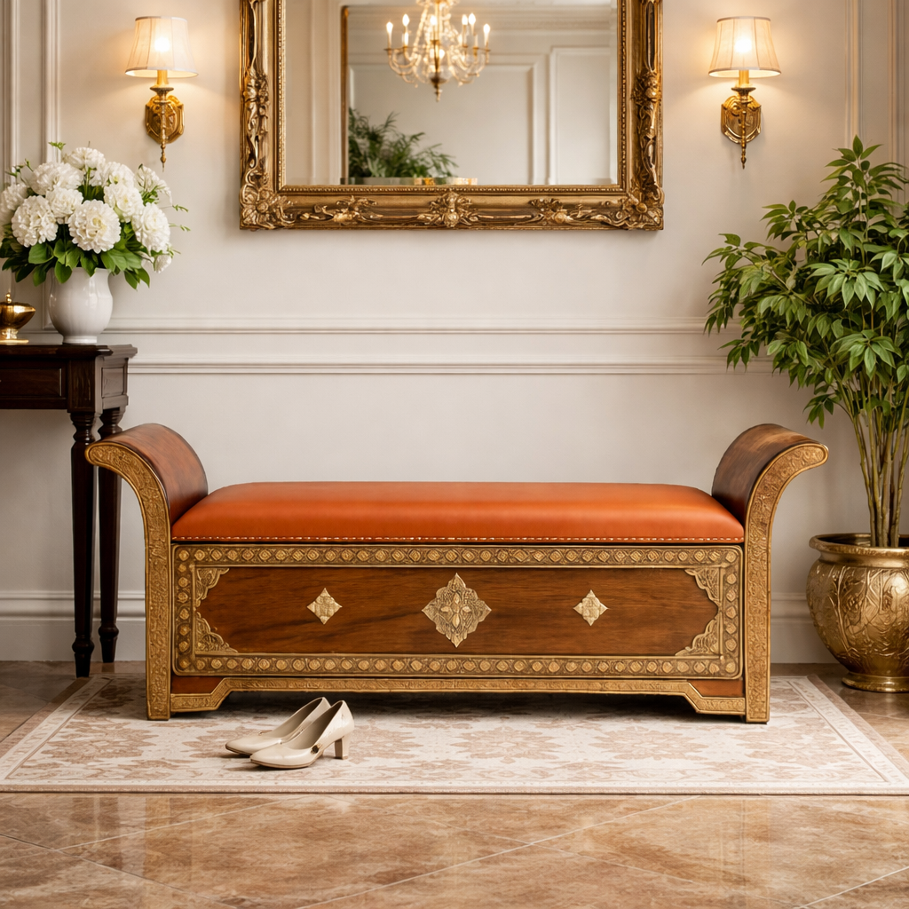 With its earthy brown finish, and delicate brass fittings, this seat brings charm and character to foyers, living rooms, and cozy corners.