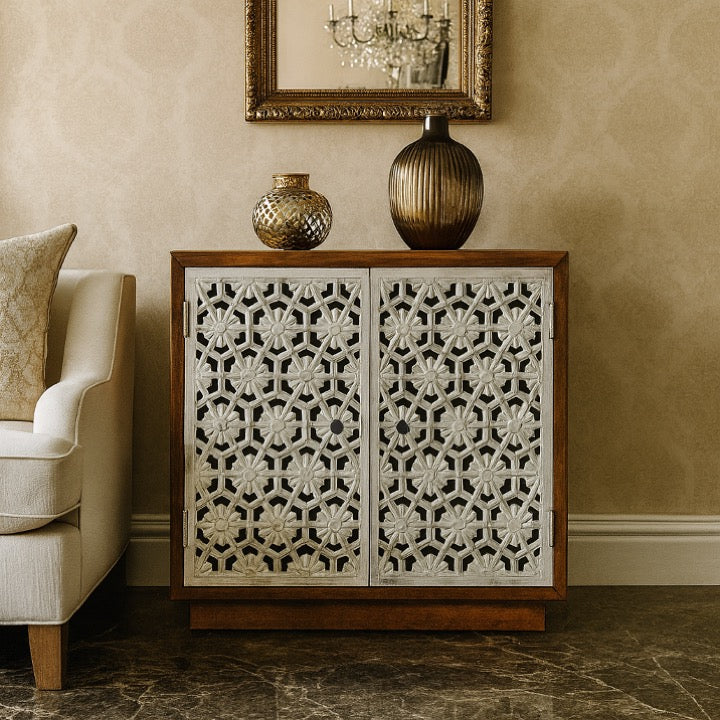 Hand carved with 1 shelve inside made from solid mango wood in the shape of delicate carving, this show-stopping storage piece has great interior space and it is ideal for living room entertainment, also can be used as an entryway piece.