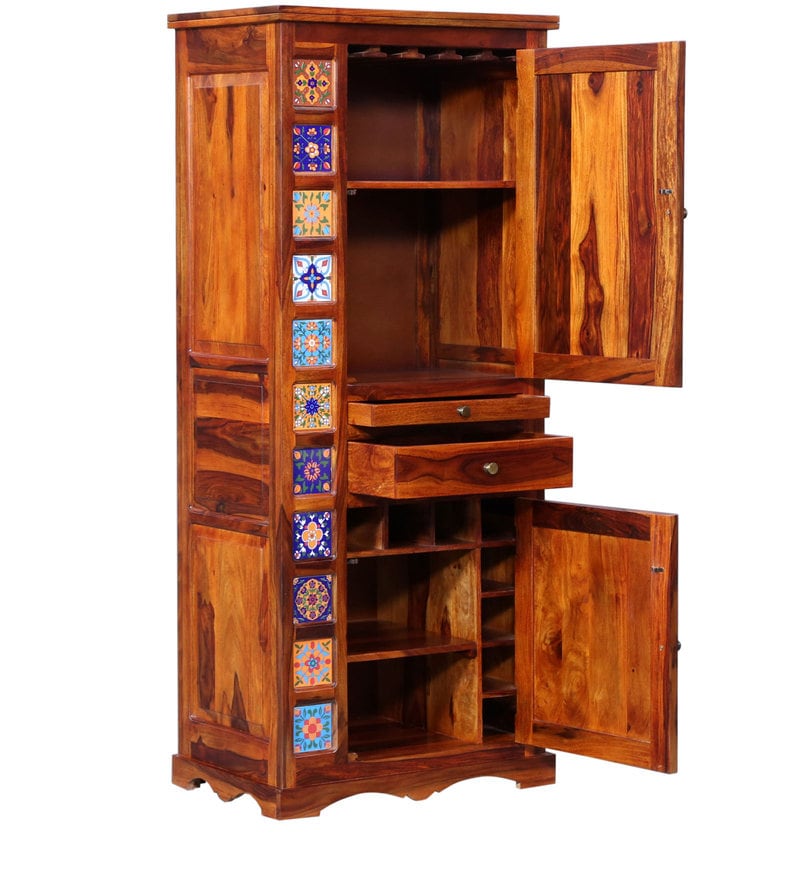 And this one is sure to make heads turn with its floral tile exterior & natural finish. It also contains 4 shelves and 2 drawers to comfortably house all your bottles & glasses.