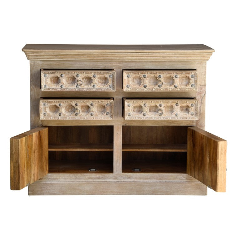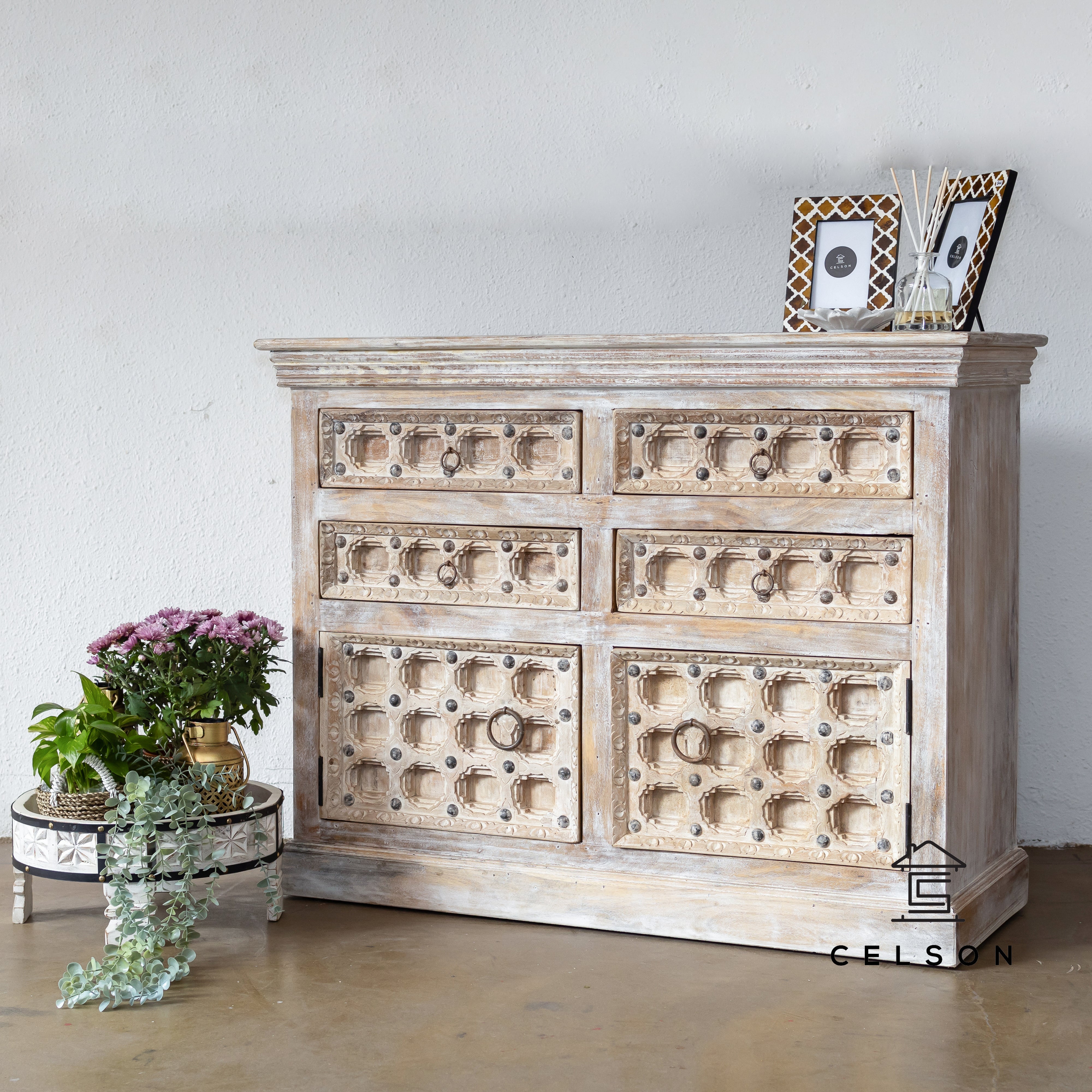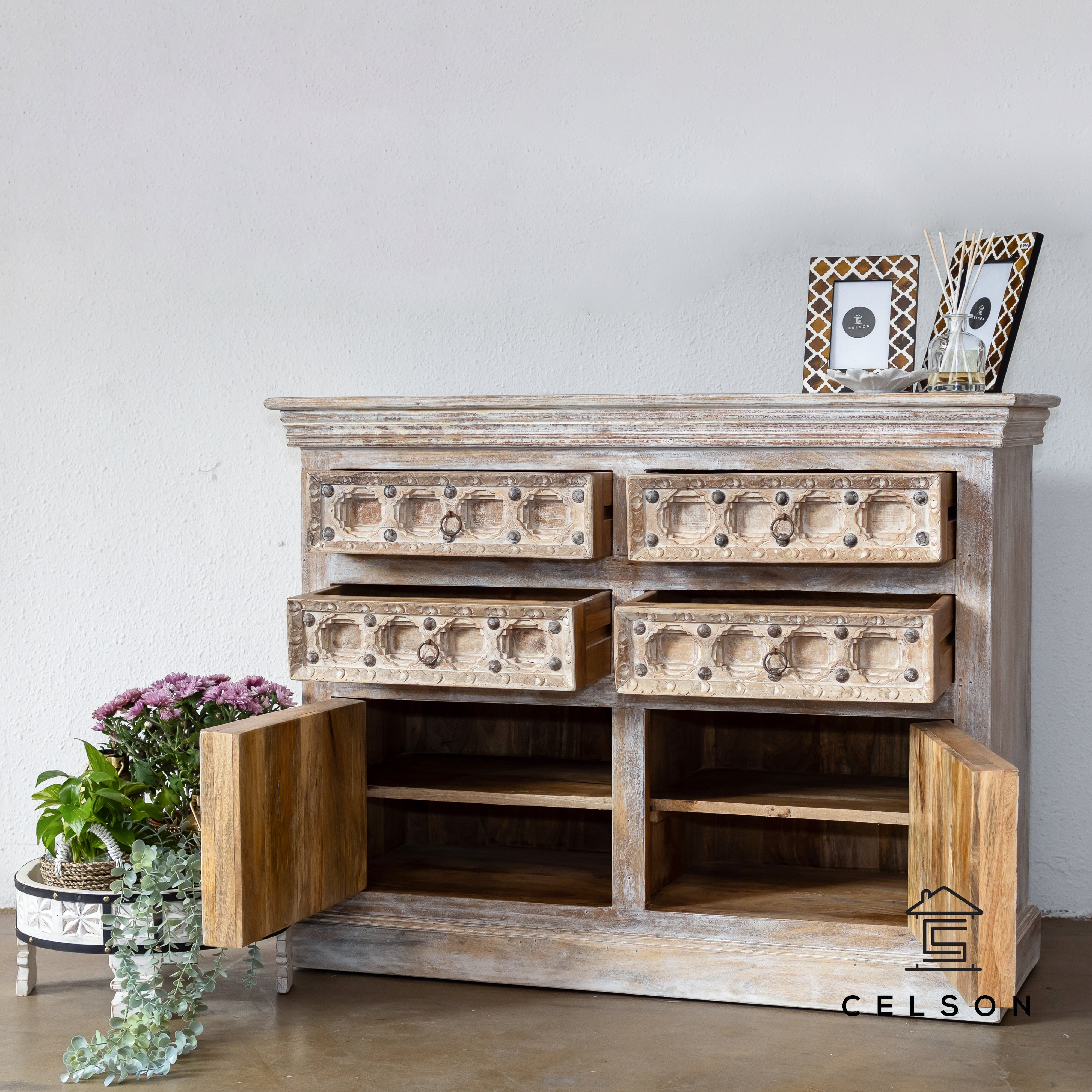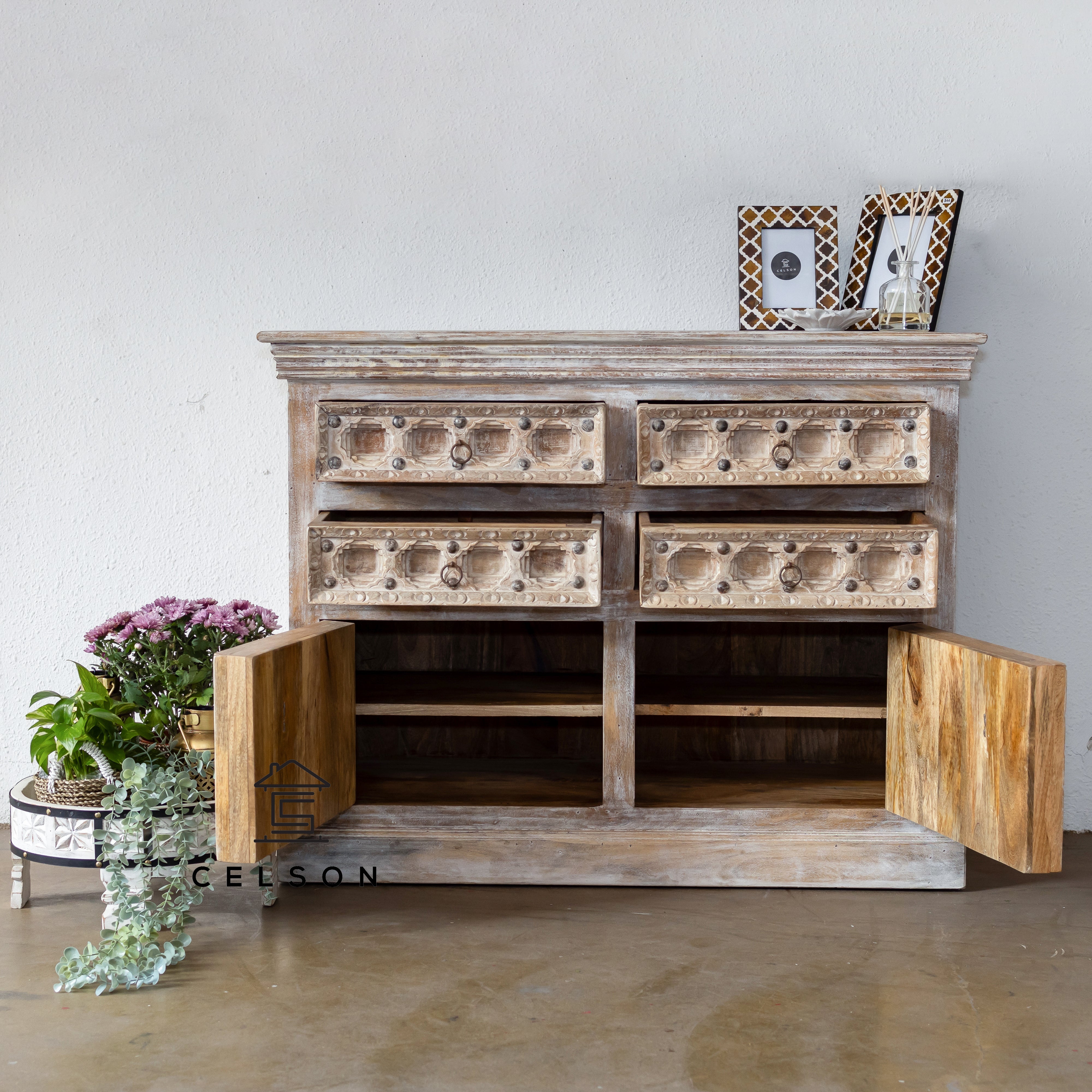 It comes with 4 drawers and 2 doors, which are perfect for storage and handles that enhance its beauty!