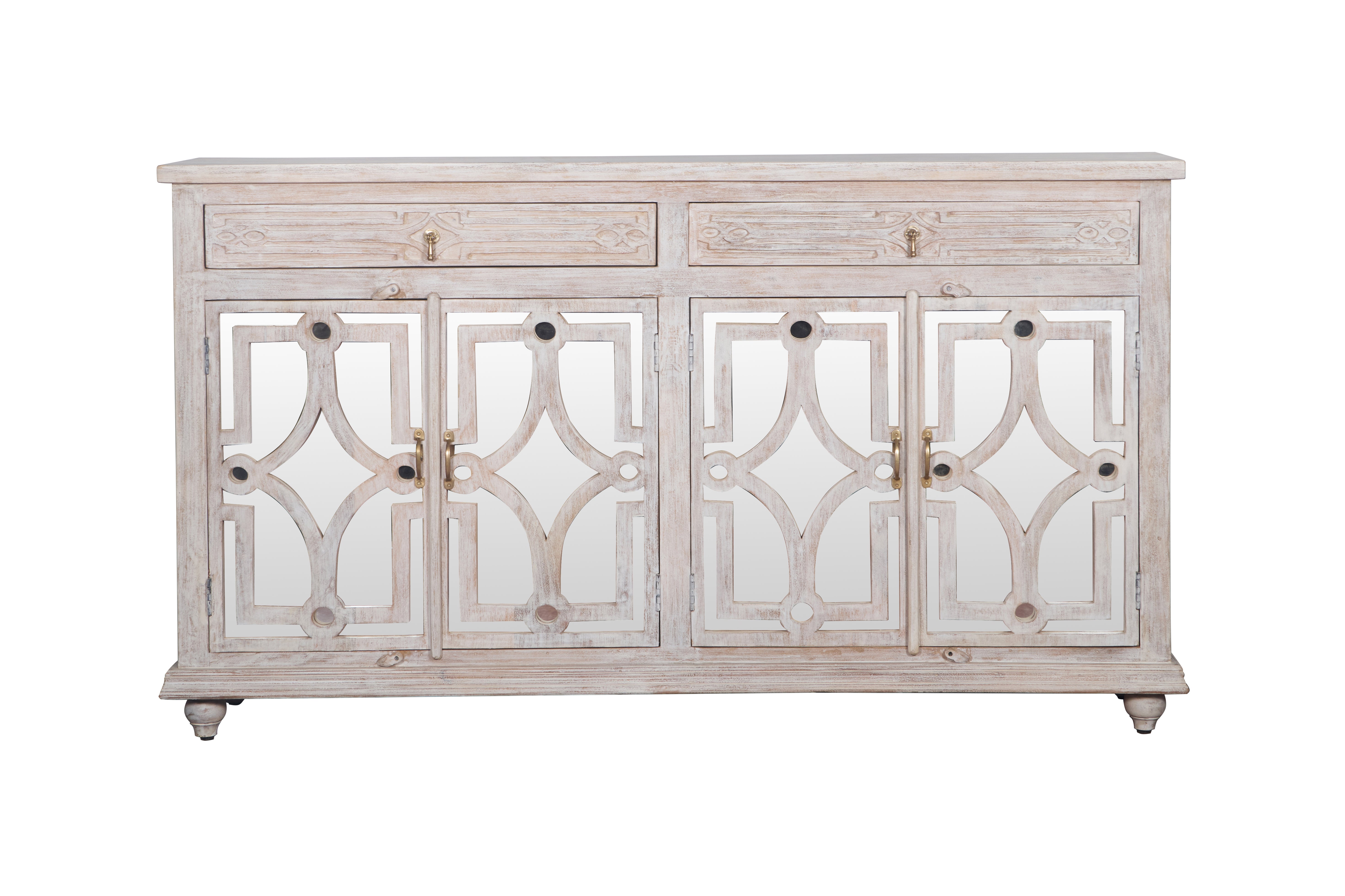 Our Lovely sideboard comes in a distressed white finish with glass panels and hand carved wooden design all over the front facade and matching metal brass hardware.