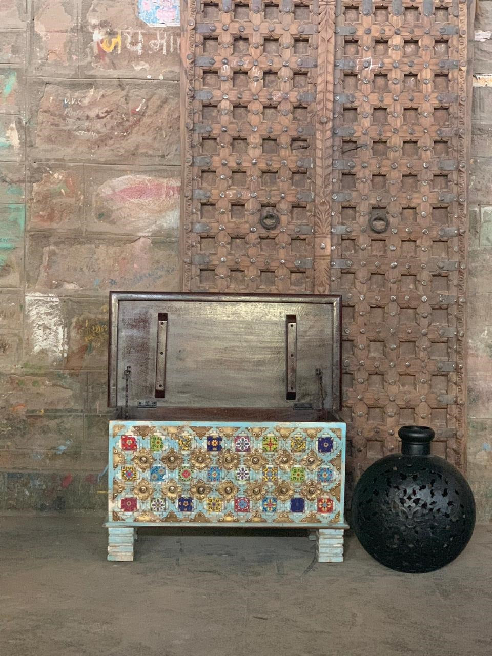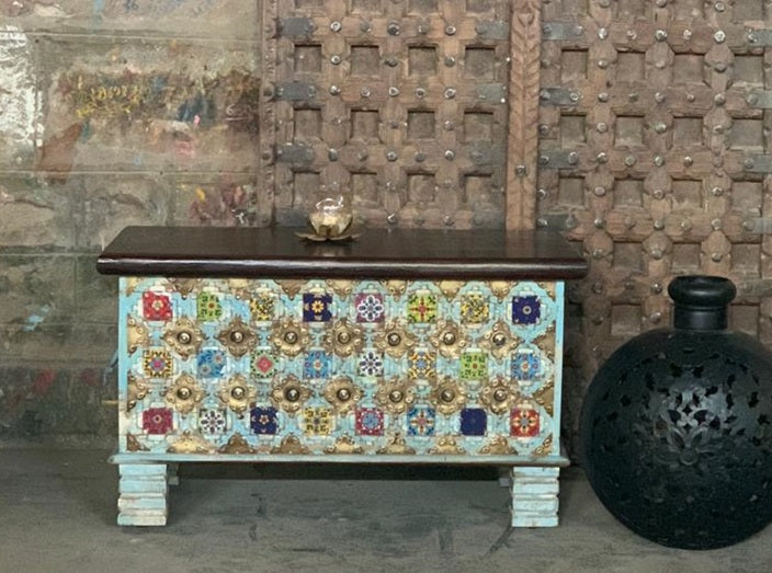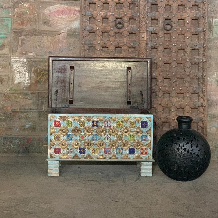 Our Multi colored Tile trunk can be used as an end of the bed bench in bedrooms while holding all your everyday bed linen, quilts and other such items. It also makes for a great coffee table in the common areas of your home with its vintage looks and appeal.