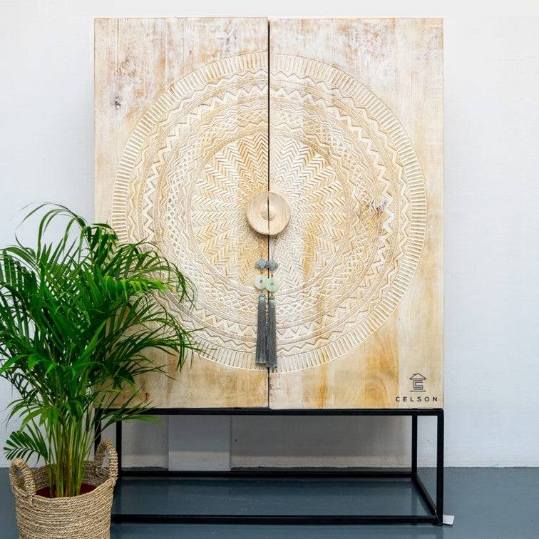 Our hand carved, white washed Moore tall cabinet can be a perfect cupboard. It has multiple shelves inside to neatly store all your clothes or crockery!!