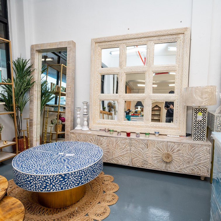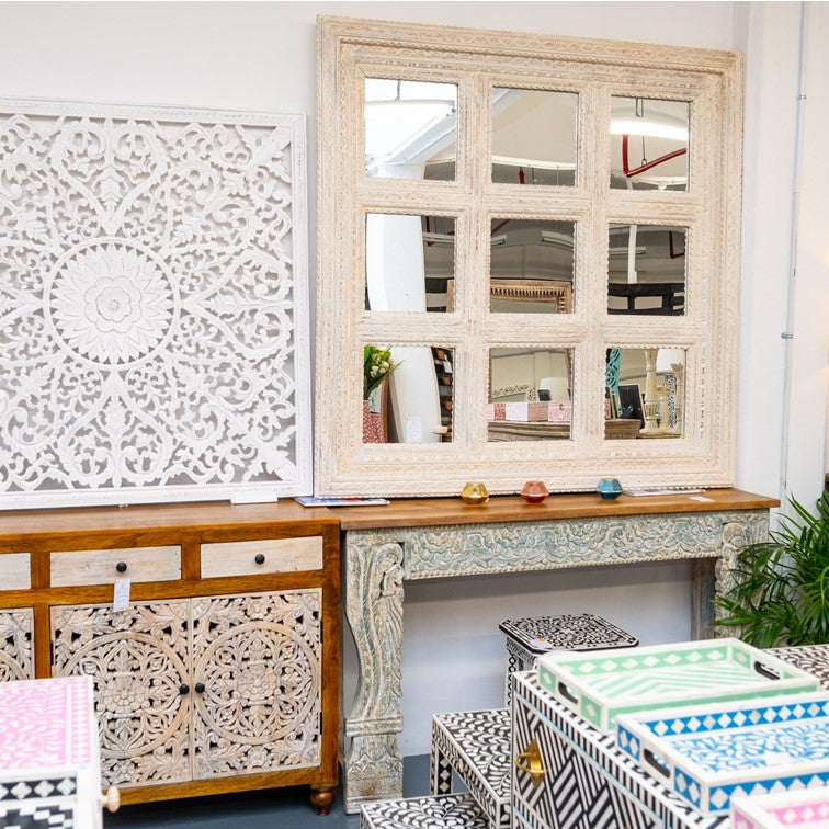 And hence you do not want to miss out on this hand carved mirror frame with intricate wood work and a distressed white finish.