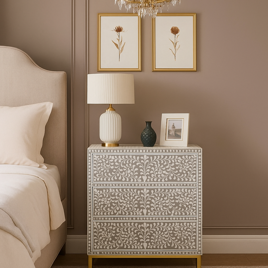 This Bone inlay Chest inlay chest of drawer definitely makes it to the top of our favorite pieces list! Along with looking stunning it also provides a good amount of storage space with its three drawers design.