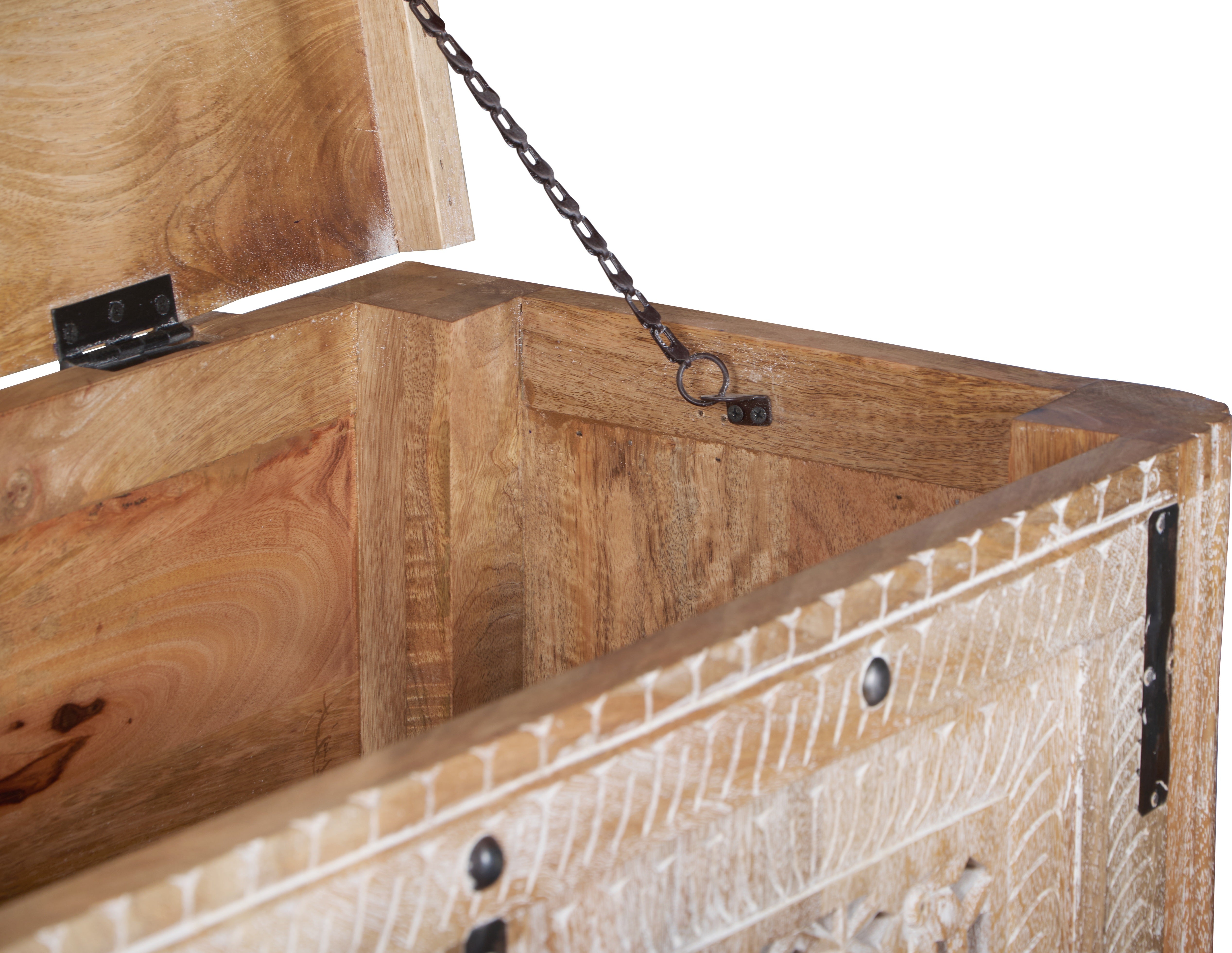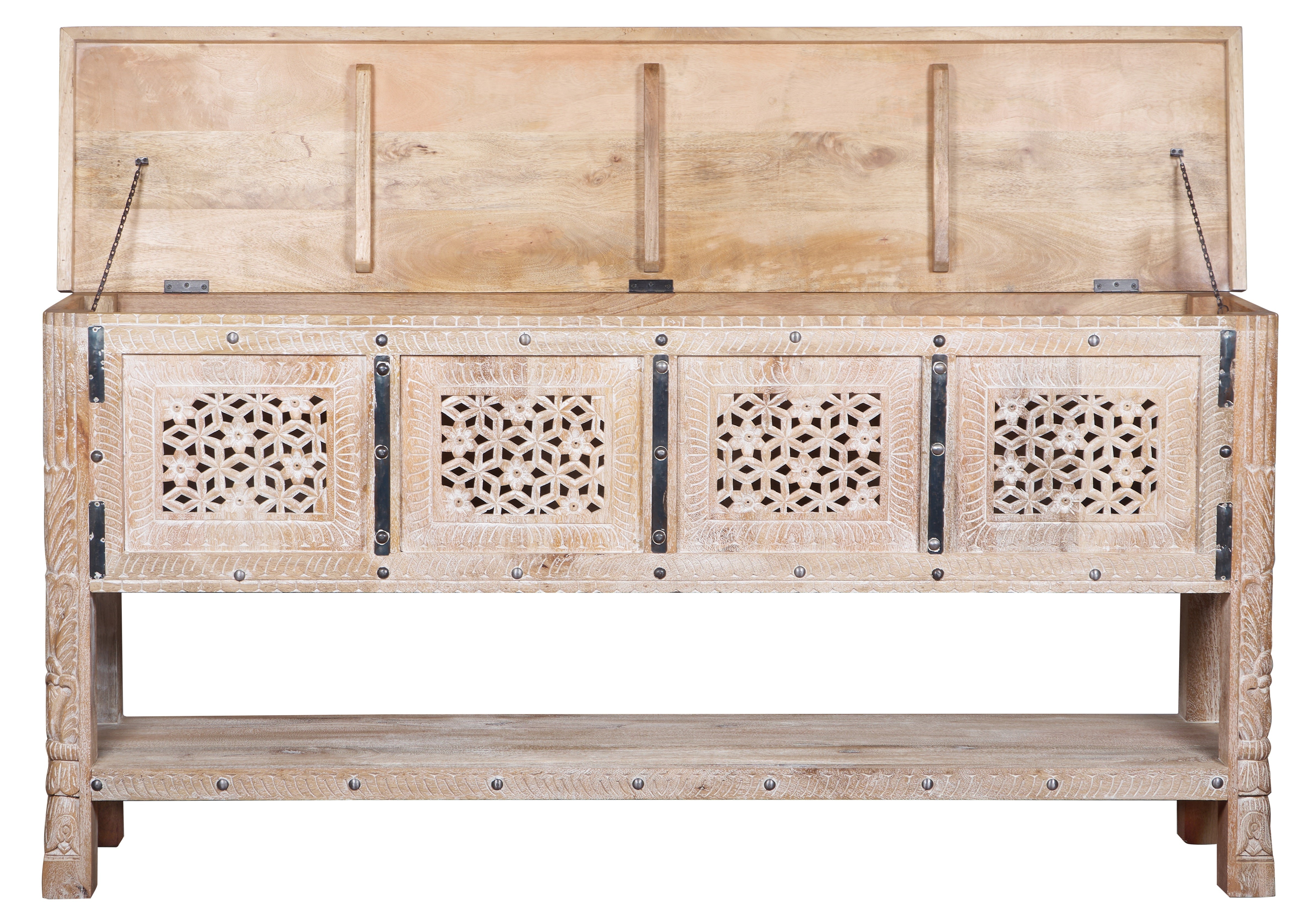 Classic meets cozy with this storage console table featuring a distressed finish and intricate carvings. Perfect for adding a vintage touch while offering functional storage for your home.