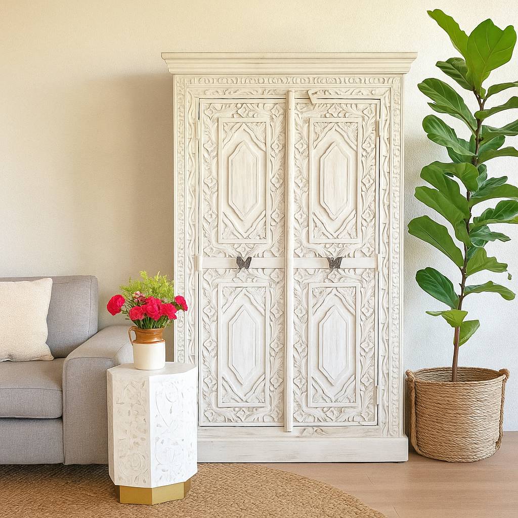 This lovely cupboard comes with hand carved doors set in a white washed finish.
