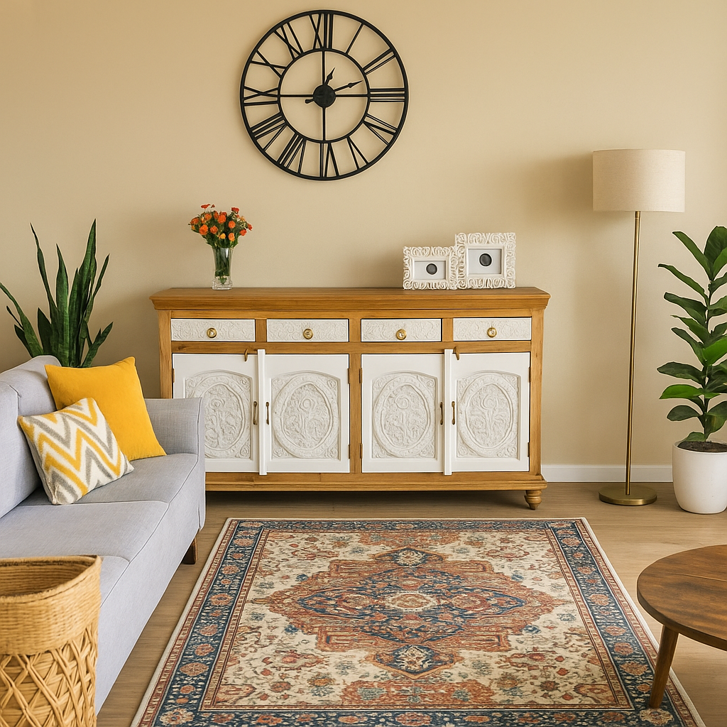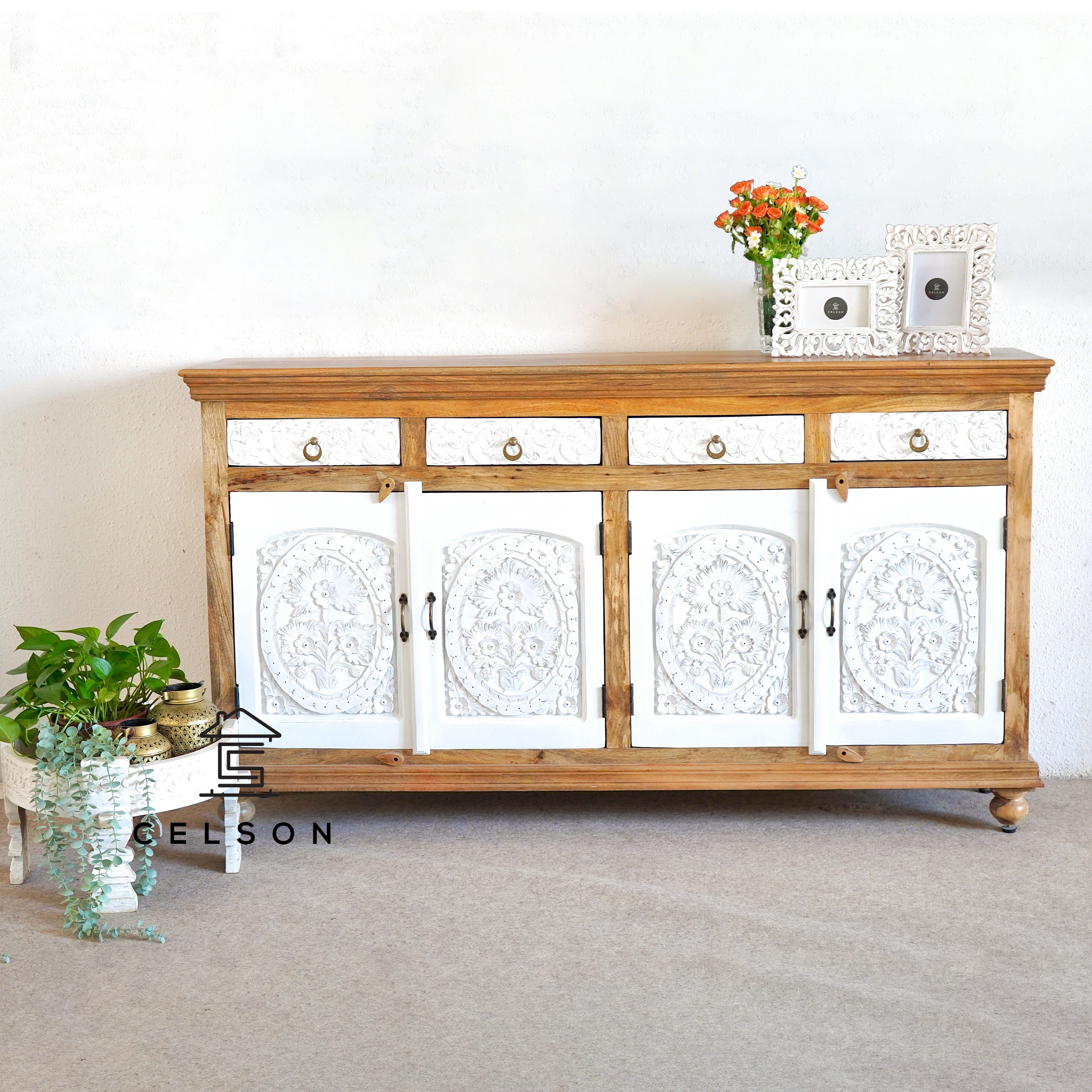 This gorgeous hand carved side board is all you need! The has 4 doors & 4 drawers, where you can easily tuck away all your extras!