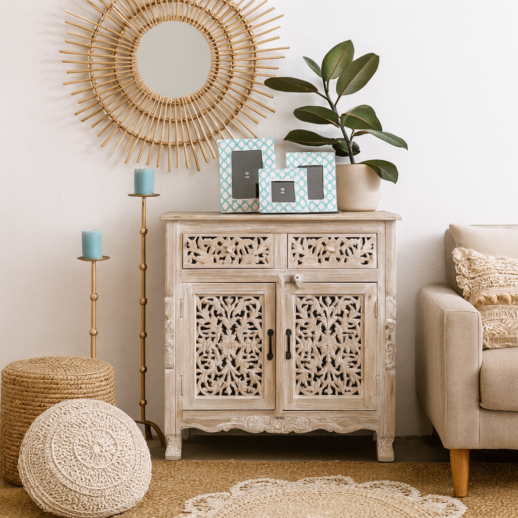 This beauty is completely hand carved by artisans in India & comes with a shelf inside and 2 drawers on top to store anything that you may want at the reach of your hand.