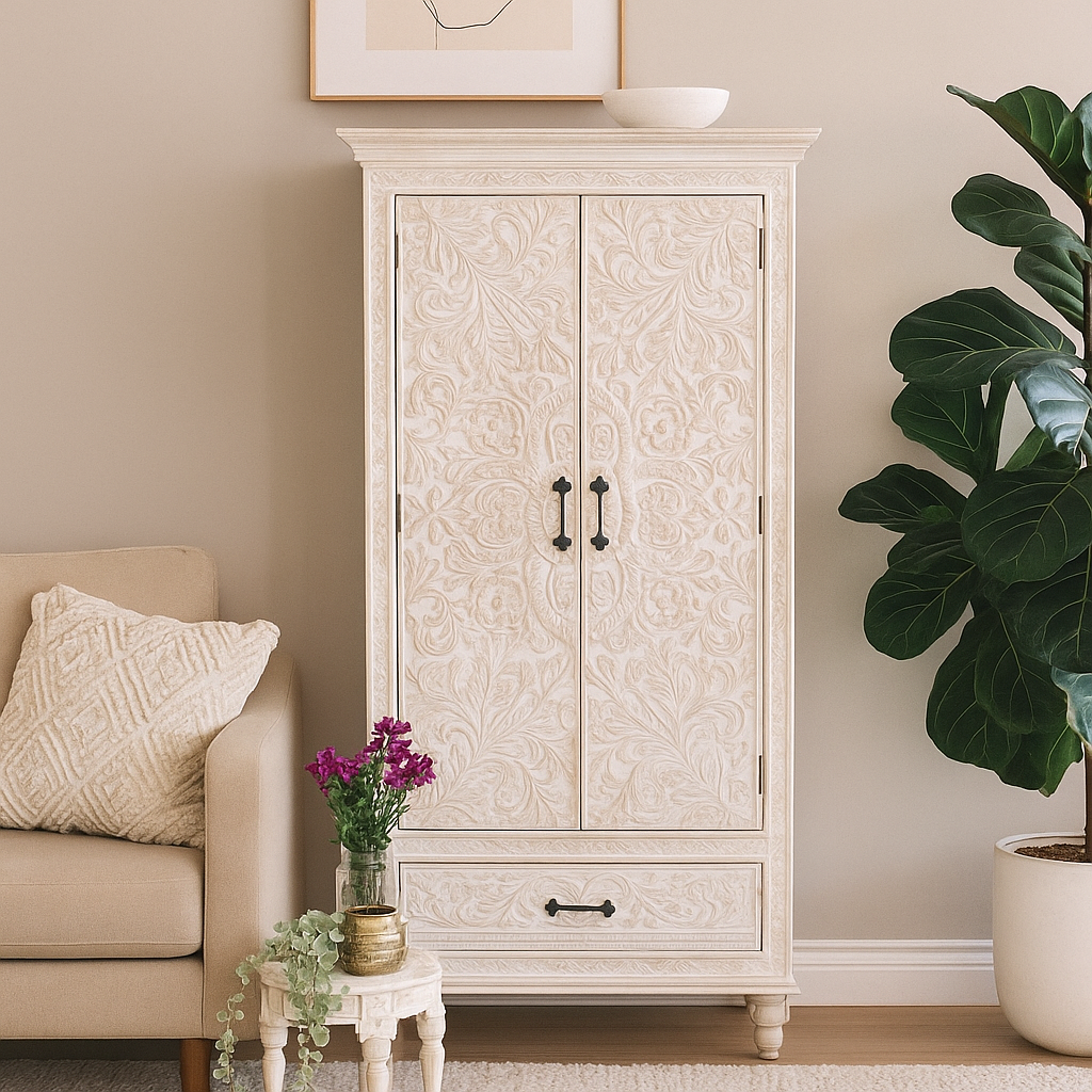 Our hand carved, distressed finish Kate tall cabinet can be a perfect cupboard. It has multiple shelves inside to neatly store all your clothes and a drawer at the bottom for all those shoes!!