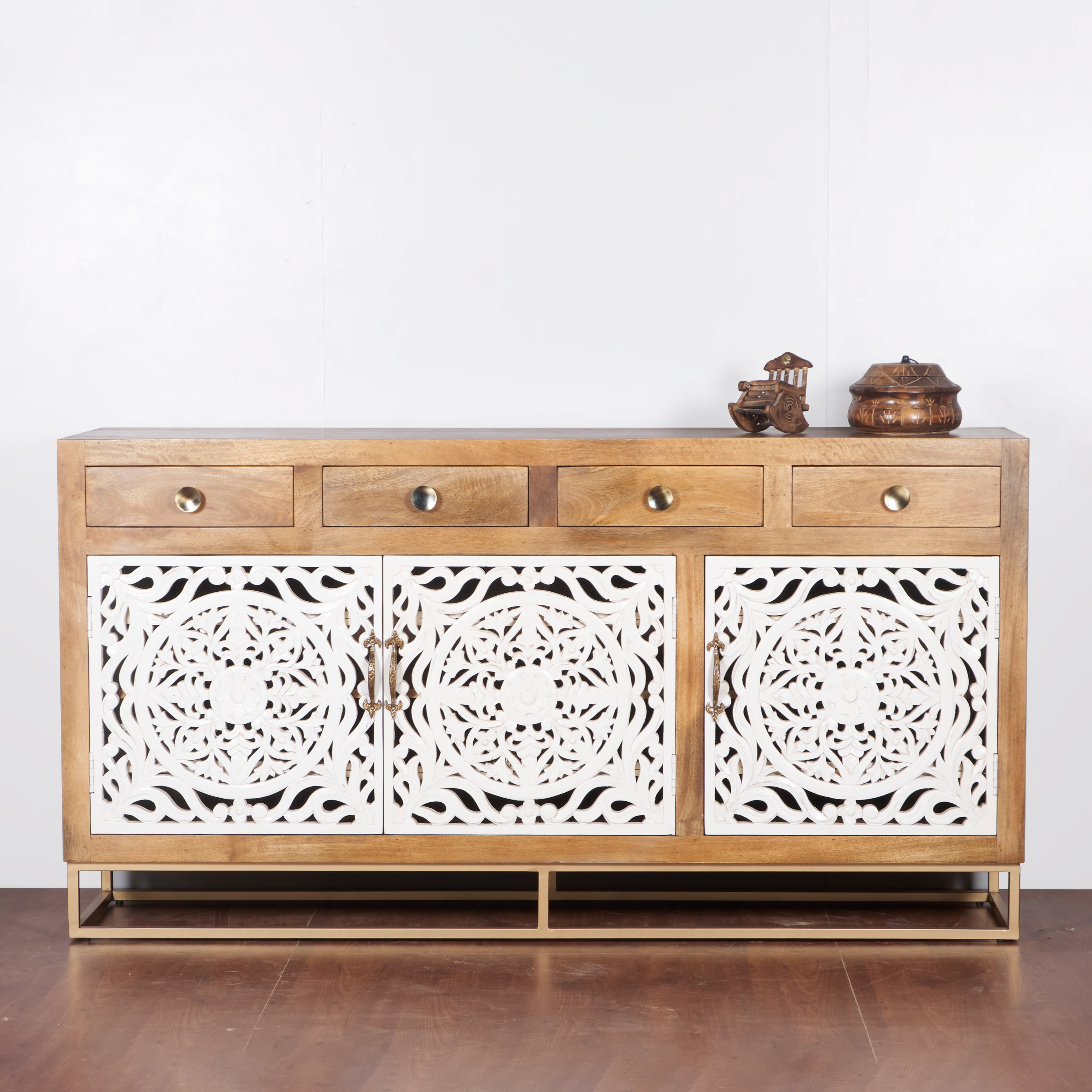 Our handcrafted sideboard features intricate carvings, a two-tone white and natural wood finish, and ample space with both drawers and doors-perfect for any cozy corner or dining room.