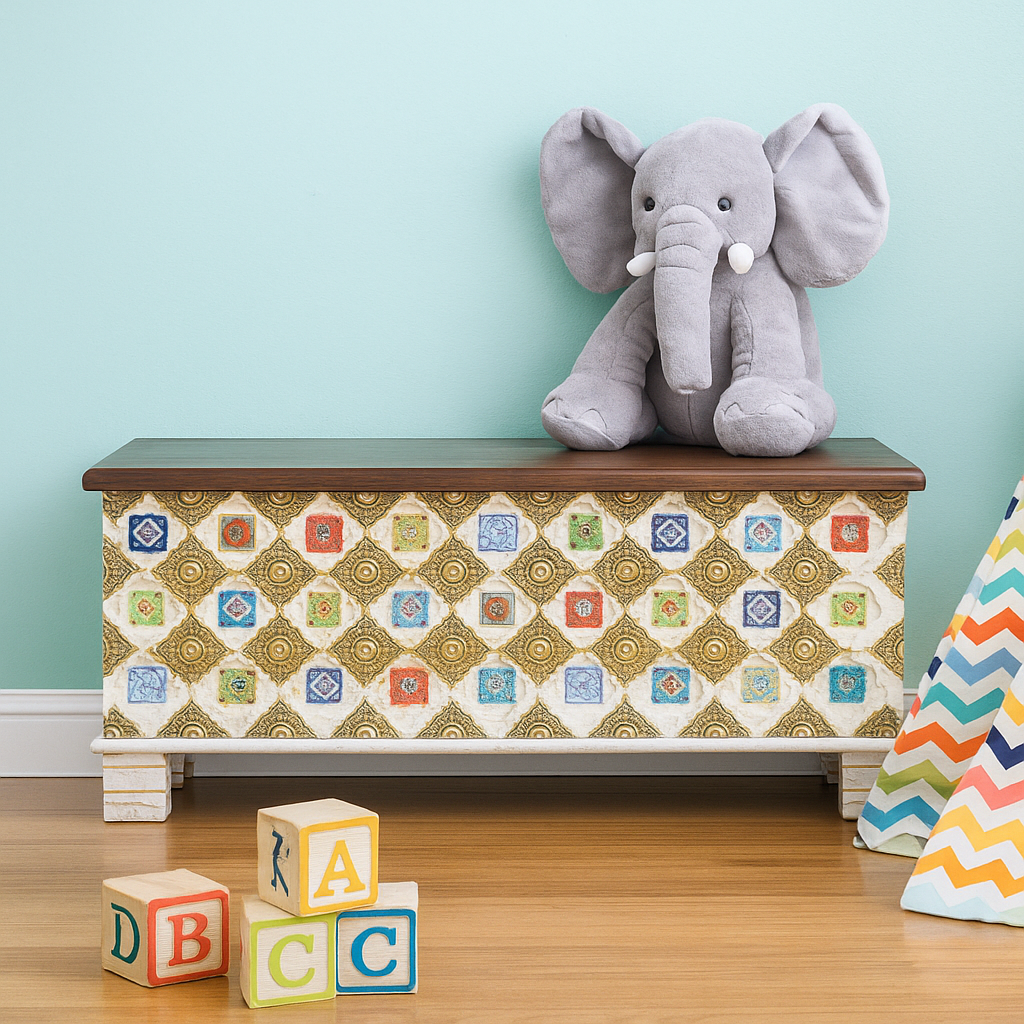 Our Multi colored Tile trunk can be used as an end of the bed bench in bedrooms while holding all your everyday bed linen, quilts and other such items. It also makes for a great coffee table in the common areas of your home with its vintage looks and appeal.