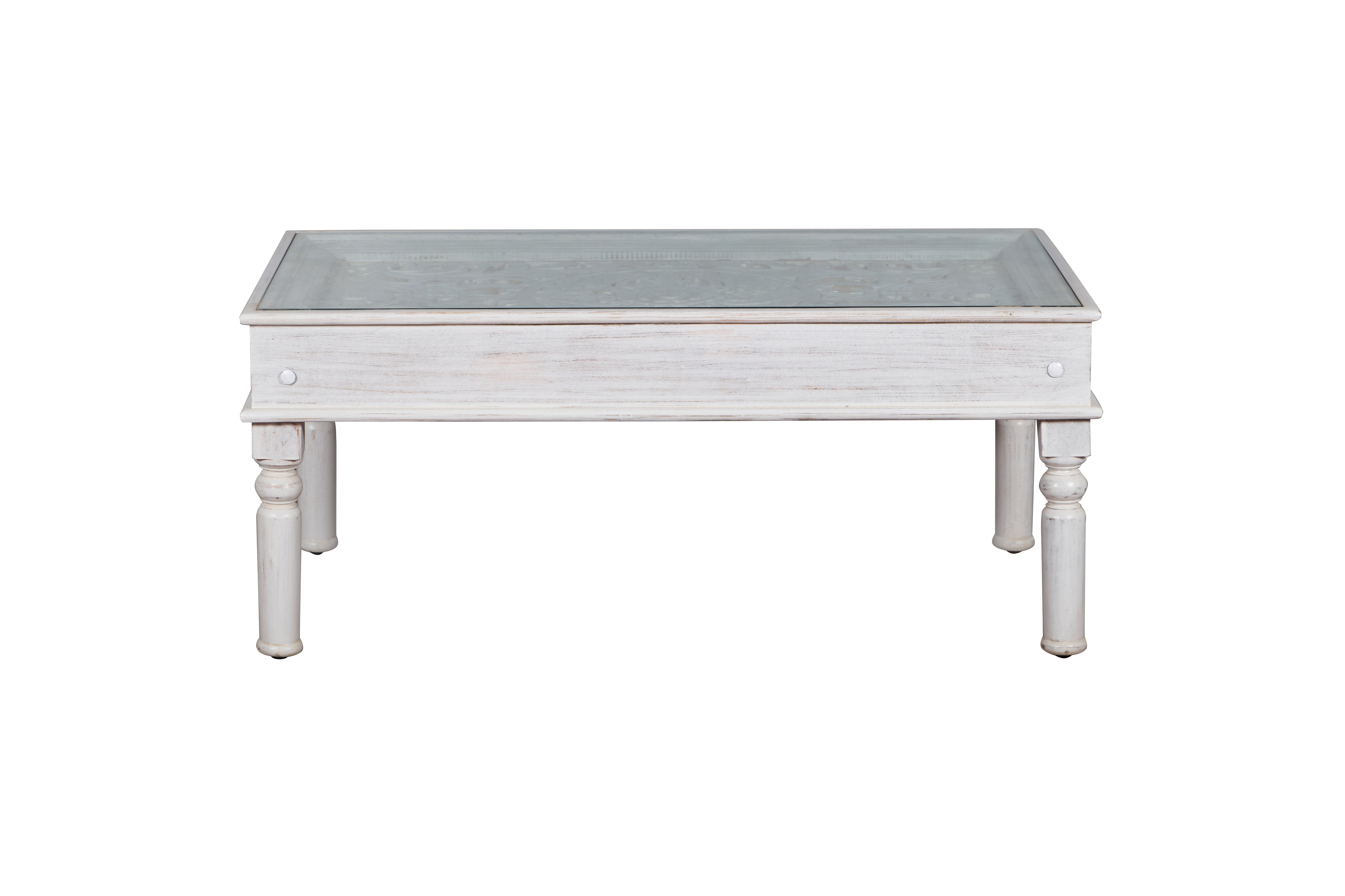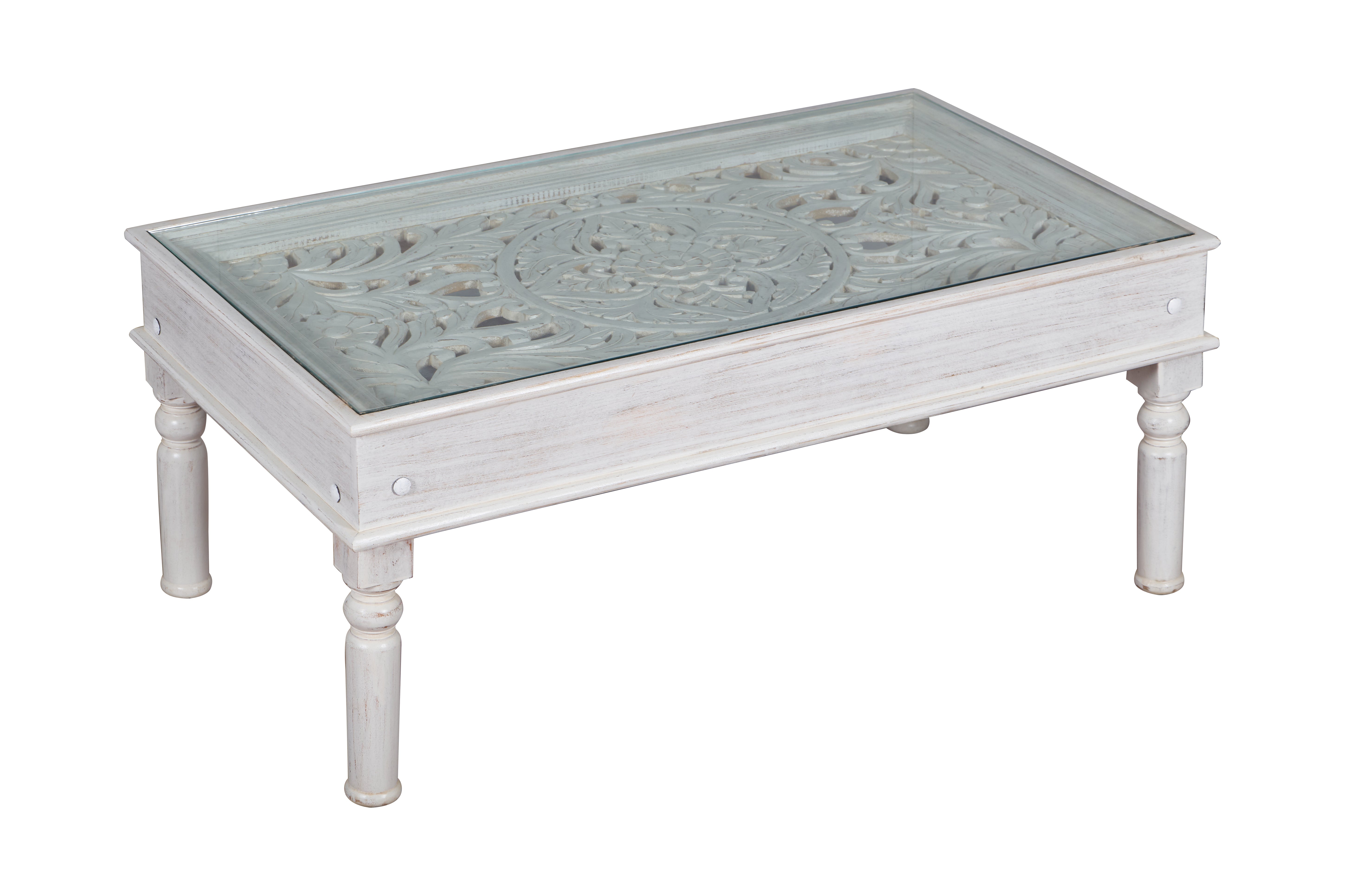 What makes it so striking is that the top is completely hand carved and it’s finished in a white distressed style. It comes with a glass top for ease of use.