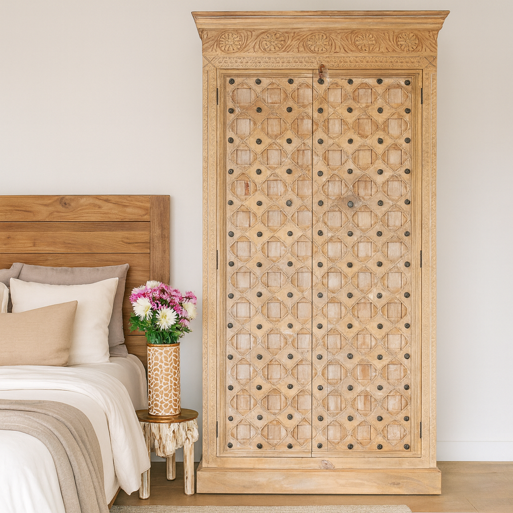 Our hand carved, white washed finish tall cabinet can be a perfect cupboard. It has multiple shelves inside to neatly store all your clothes.