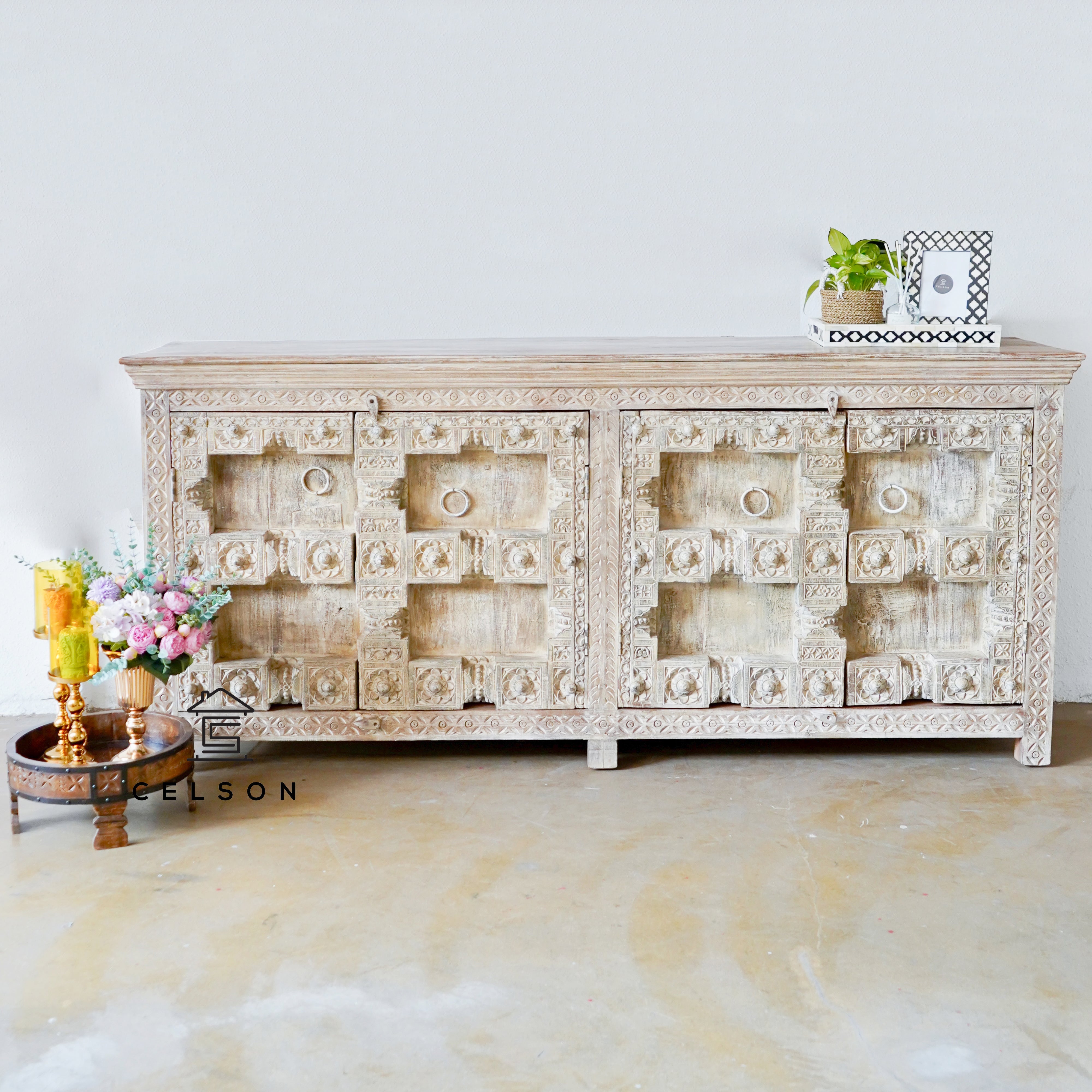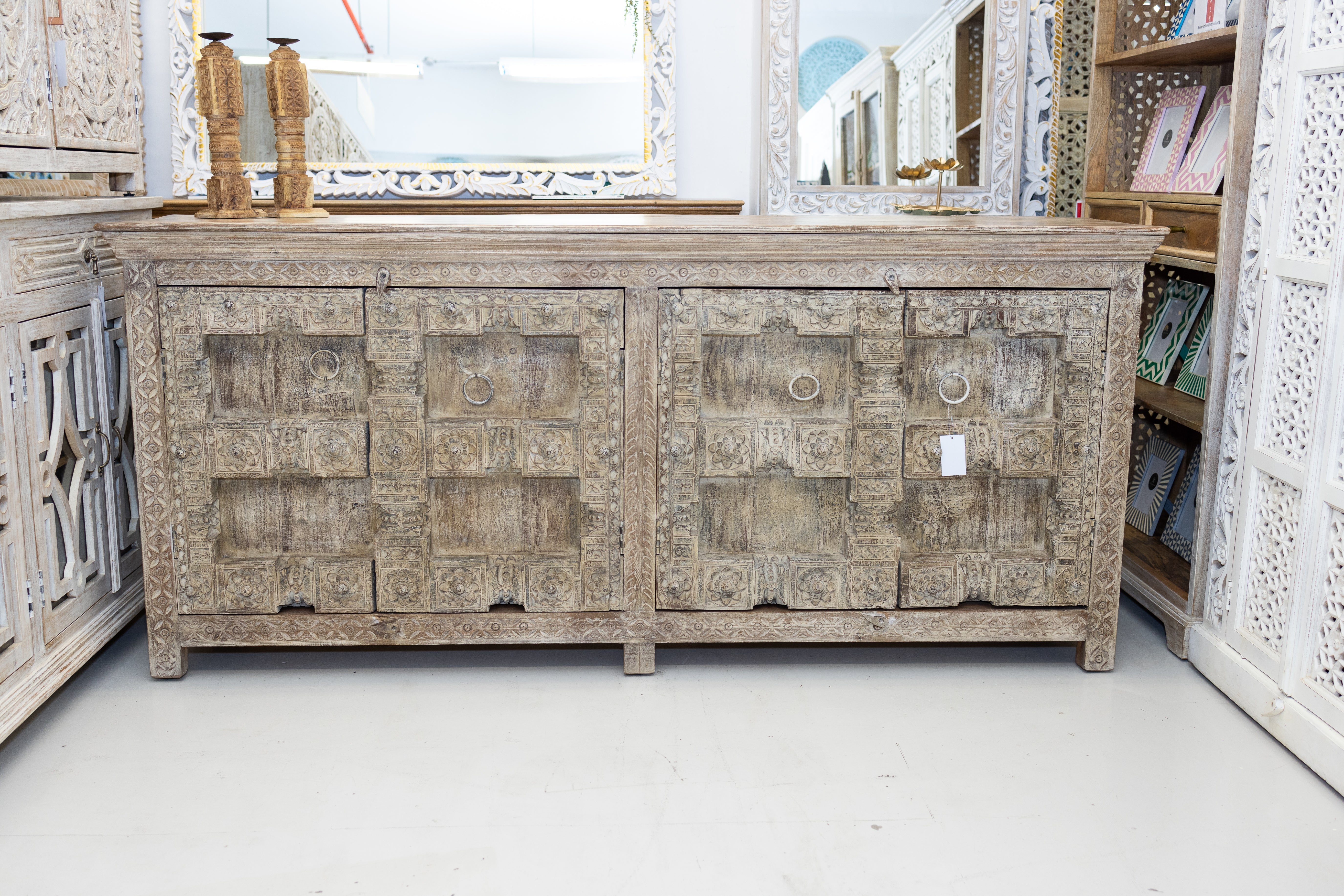 Bring a piece of history into your home with this stunning hand-carved vintage sideboard. Featuring four doors and exquisite craftsmanship, it combines beauty and utility to elevate your décor and organize your space effortlessly.